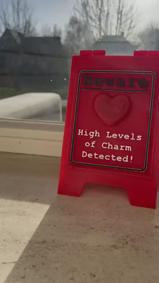 Funny Desk Sign Red A Frame – “Beware High Levels of Charm” Perfect Quirky Gift & Cute Novelty Tabletop Decor!